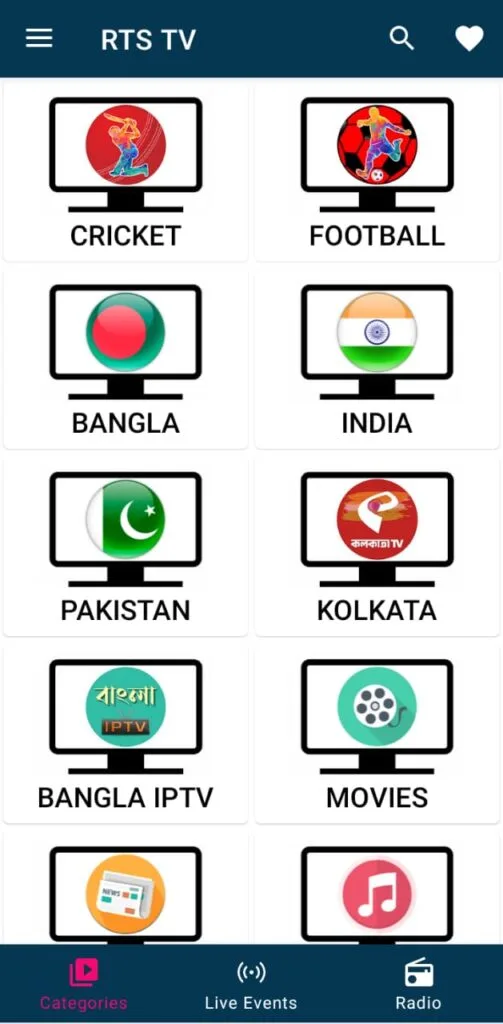 RTS TV satisface diversos intereses, ofreciendo categorías como Críquet, Fútbol, Bangla, India, Pakistán, Kolkata, Bangla IPTV, Películas, Noticias, Música, Informativo e Infantil. Con tanta variedad, hay contenido para todos en la familia.
