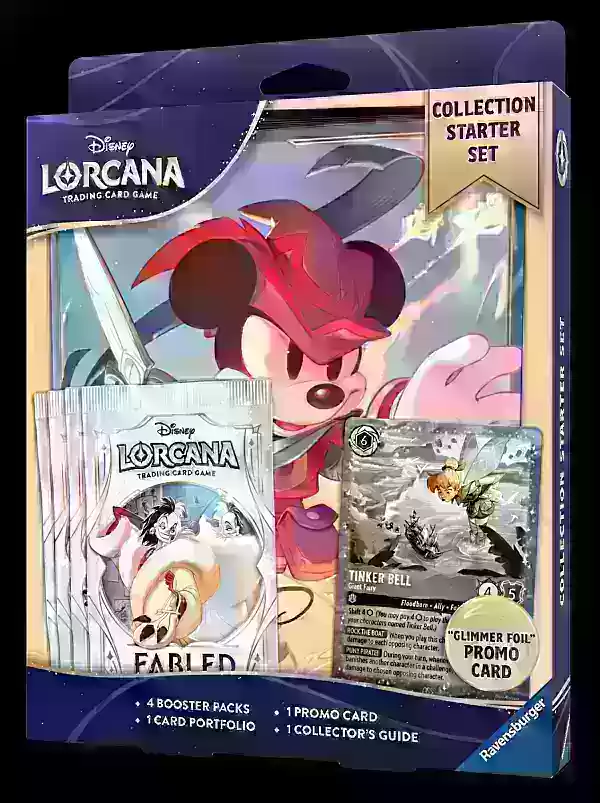 Los nuevos jugadores pueden sumergirse con el Set de Inicio de Colección, que incluye cuatro sobres de refuerzo de Fabled, una Carta Promocional Glimmer Foil de Tinker Bell (Hada Gigante), una carpeta de cartas de Mickey Mouse (Sastrecillo Valiente) y una guía para coleccionistas.