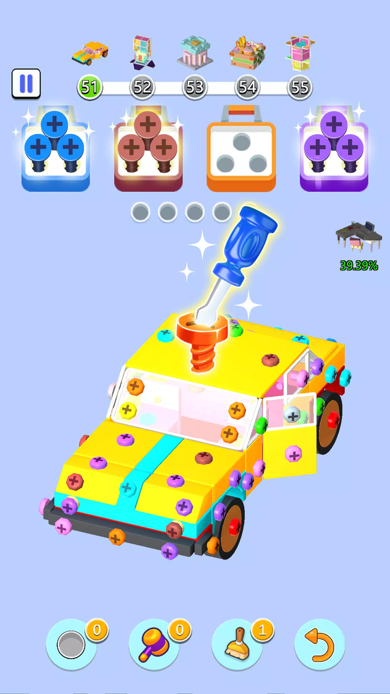 Dive into the world of Screw Blast, where you disassemble intricate 3D objects by unscrewing colorful nuts and bolts! Experience a vibrant puzzle adventure that combines casual fun with 3D mechanics. Tackle beautifully designed models adorned with playful hardware components—each level challenges you to dismantle these assemblies through smart screw sorting strategy. Remember, efficient organization is key in this spatial puzzle: sharpen your color-matching skills!