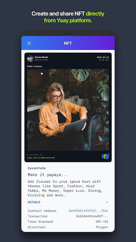 NFT作成:Yaay NFTスタジオにより、ユーザーはアプリ内で直接自分の投稿からNFTを作成できます。この独自の機能は、他のソーシャルメディアプラットフォームとの差別化を図り、アーティストやコンテンツクリエーターに新たな機会をもたらします。