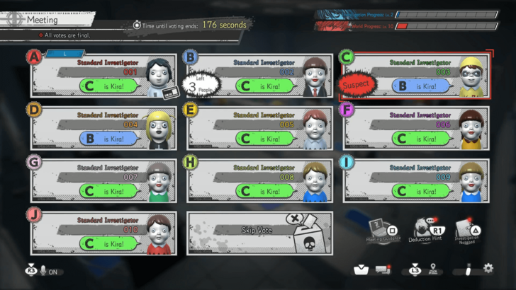 • Meeting Phase: Players convene to discuss their suspicions, vote to identify Kira, and attempt to bring the killer to justice (or potentially wrongly accuse an innocent teammate).