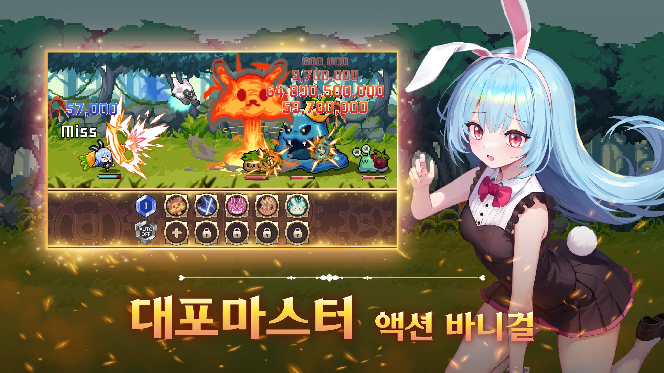 WildBUNNY现已登场!限时万圣节服装活动!你发现了一款令人惊艳的全新独立游戏。今日正式上线!立即开始游戏,你将成为排名第一的玩家!我们会根据玩家意见进行更新。正式上线庆典·冒险通行证赠送·圣诞节活动你将成为兔兔镇的焦点。自从村庄遭到袭击后,你开始复仇。现在,你必须变得强大。自动战斗系统升级并享受强大的技能。玩家对战模式与顶级对手一较高下!你能比其他人强大多少?装备精良才能成为最强。只需战斗,即可解锁传奇武器!我们始终期待您的疑问和反馈。请随时通过以下官方链接联系我们。官方联系方式:cafe.naver.com/bunnyrpg