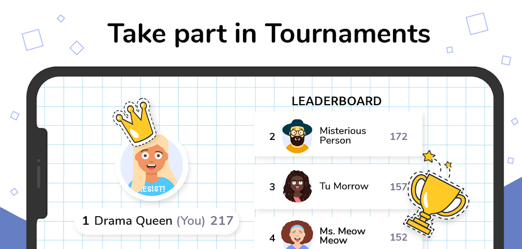 參加包含特殊字詞挑戰和主題活動的定期錦標賽。在全世界其他玩家面前展現你的語彙實力,贏得獨家獎勵與榮耀稱號。