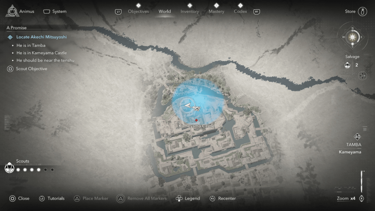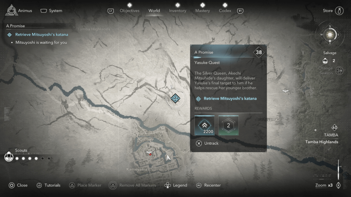 为了继续任务,银皇后要求Yasuke营救她的兄弟Akechi Mitsuyoshi,以换取有关其真正目标的信息。逃离塔达银矿后,向北前往卡米亚马城堡。在Kameyama Senneji Temple以北的Kakurega储备弹药和口粮上。激活探路者在城堡中航行,在您前往居住区时消除守卫,在那里流血的仆人将为您提供城堡Tenshu的钥匙。